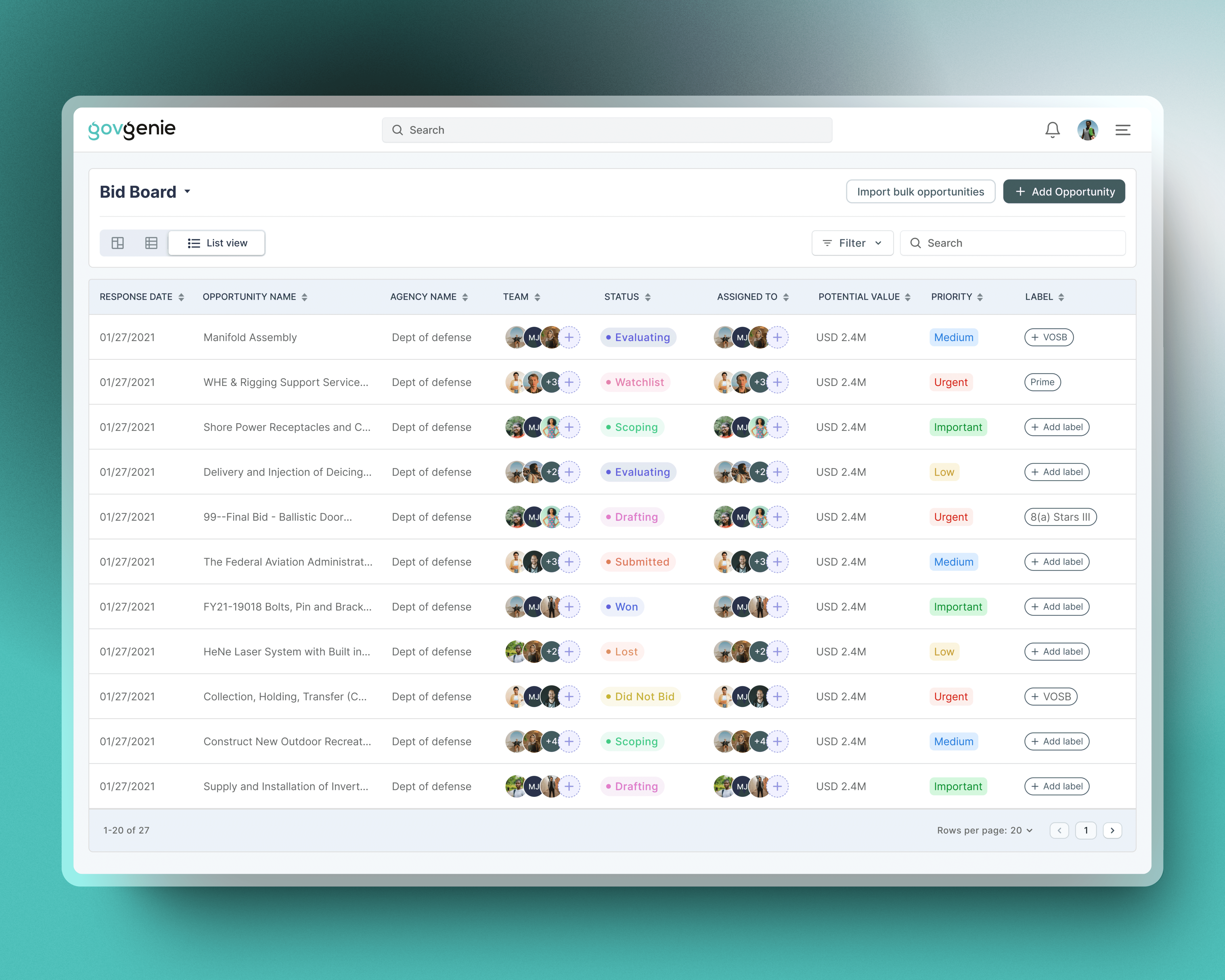 Government contracting tool for discovery, bidding, teaming, and proposals. I improved usability through better onboarding, customizable dashboards, and a quick-capture browser extension.